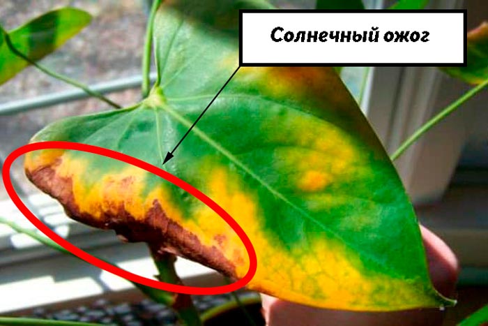Прямых солнечных лучей необходимо избегать, так как они вызывают ожоги на листьях (желтые или бледно-коричневые пятна) и могут спровоцировать общий перегрев растения.