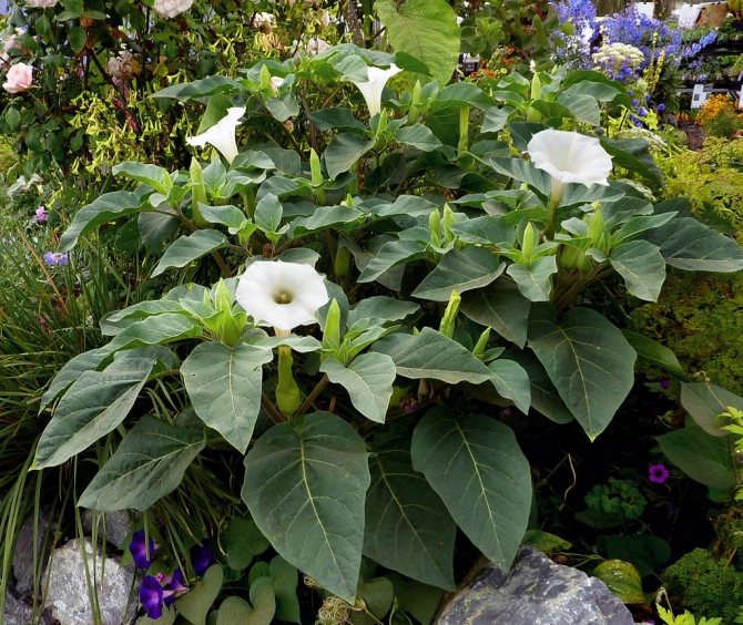 - Дурман обыкновенный (Datura Stramonium), народное название цветка – датура голубая. Его большие целостные листья очень декоративны, а воронкообразные крупные белые цветы создают на их фоне резкий художественный контраст. Наиболее декоративная разновидность цветка, Datura srtamium var.tatula, имеет оригинальные сине-голубые соцветия.