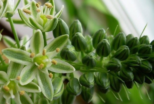 - В апреле на конце цветоноса распускается примерно 20 цветков, по форме напоминающие звёзды. По цвету они белые или слегка желтоватые.