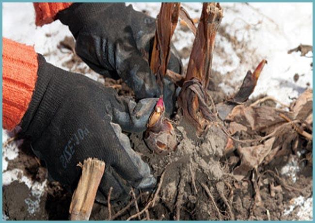 В марте нужно разделить перезимовавшее корневище. В результате на каждом полученном фрагменте должна быть 1 большая стеблевая почка или 2-3 маленьких. Участки срезов нужно обработать древесным углем и слегка просушить.