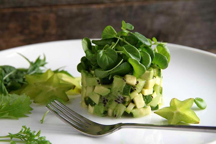 Кресс-салат и руккола, являясь близкими родственниками, отлично сочетаются в блюдах. К подобным продуктам относятся «зеленые» специи: мята, петрушка, майоран, хмели-сунели. Микрозелень раскрывается в овощных блюдах, как дополнение к мясу или рыбе (в свежем виде).