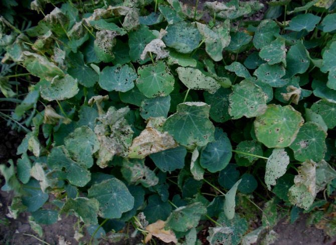 Выращивание и уход за настурцией предполагает периодический осмотр растения на наличие вредителей: паутинного клеща и крестоцветной блошки. Борьба с ними заключается в обработке инсектидицом «Профилактин».