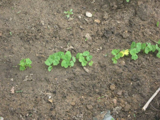 Перед тем как высаживать семена, их помещают на очень короткое время в воду, нагретую до 40 градусов С, затем замачивают на 24 ч. Высевают только в хорошо прогретый перекопанный и выровненный открытый грунт. На грядке делают лунки с интервалом 25 см, бросают в них по 2 семечки. Если даже в конце весны наблюдаются частые похолодания, то грядку для посадки капуцинов поливают хорошо нагретой водой, а после посева семян еще и накрывают ее пленкой.