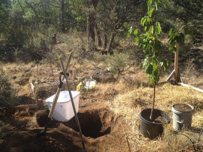 Яму для саженца подготавливают за 2 недели до высадки: диаметр не менее 1 метра, а глубина должна достигать 60-80 см. При вынимании почвы в центр ниши вбивают кол, возвышающийся на полметра над уровнем участка, а верхний плодородный слой складывают отдельно от нижнего и перемешивают с компостом и удобрениями: