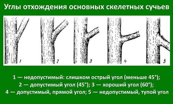 - Совершенно не нужны ветки, растущие под очень острым углом (т.е. их угол отхождения менее 40-45 градусов) и образующие так называемые «вилки». Их также вырезают