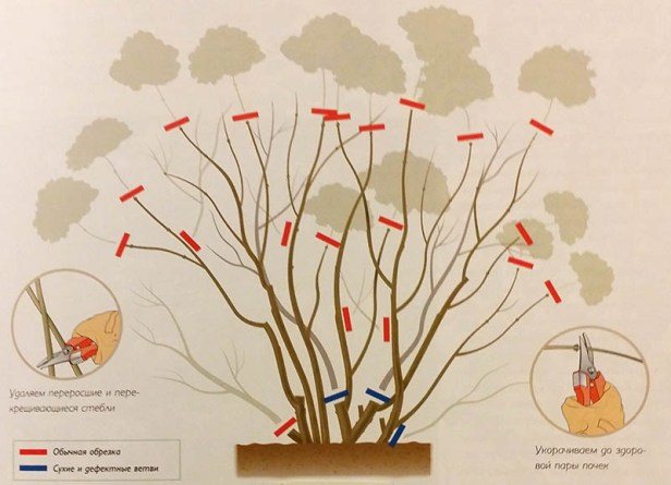 Если листва на кустарнике еще осталась, существует риск того что после обрезки растение выпустит молодые побеги из боковых почек. Это ослабит куст перед зимовкой. Поэтому постарайтесь как можно дольше оттягивать обрезку побегов.