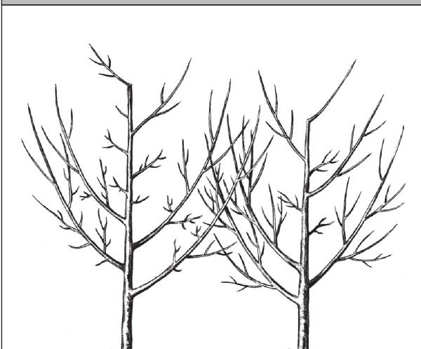 На 2-й год с момента пересадки деревца на постоянное место оставляют 3–4 боковых симметрично расположенных побега и позволяют им свободно развиться (расстояние между скелетными ветками — примерно 15 см). К концу сезона каждая скелетная ветвь имеет прирост — 2–4 ветвления — в июле проводят прищипку. На 3-й год выбранные скелетные ветви укорачивают до 50 см (примерно оставляют 10 почек), проводят санитарную обрезку (описание дано выше).