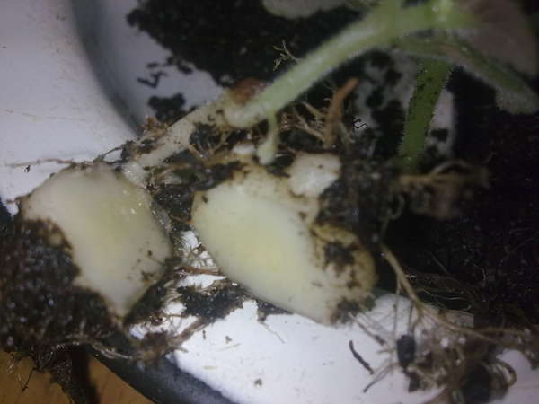 - Очистить его от сухих и гнилых корешков. Если на клубне имеются гнилые участки, необходимо срезать их ножом. Места срезов присыпать измельченным древесным углем.