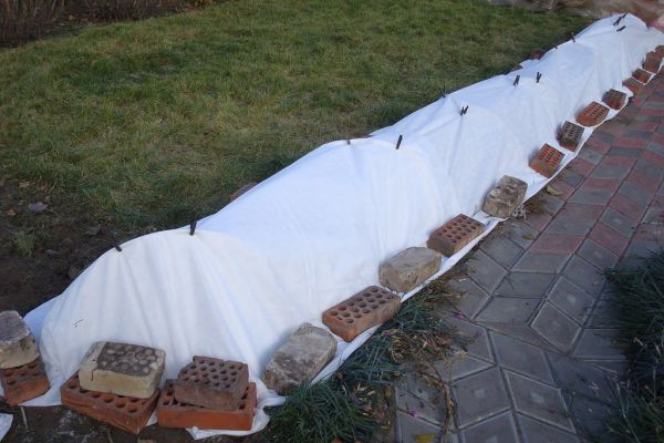 - Теперь нужно тщательно зафиксировать агроволокно, например, по периметру обложить кирпичами, камнями, землей. При этом фиксировать нужно с трех сторон, одна сторона должна оставаться открытой, чтобы осуществлялась нормальная вентиляция. А когда температура воздуха будет держаться в районе минус 10 градусов нужно зафиксировать и открытую часть агроволокна.