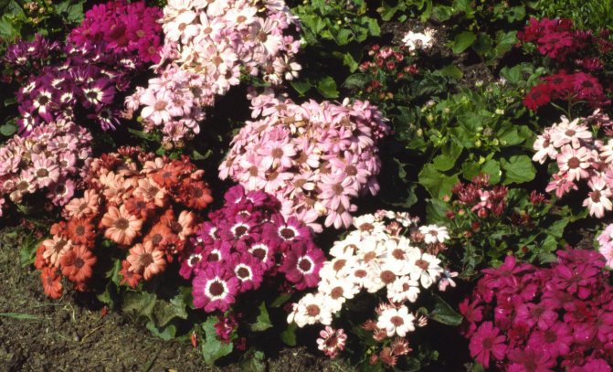 Красивоцветущие сорта цинерарии кровавой солируют в оформлении клумб на открытых светлых пространствах, участвуют в создании разноцветных ковров, украшают альпинарии, бордюры и миксбордеры.