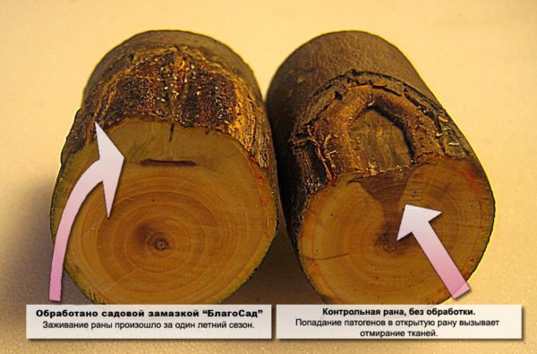 Плодовые деревья, в отличие от хвойных, не выделяют достаточное количество смолы. Поэтому любые срезы, диаметр которых превышает 10-рублевую монету, подлежат обязательной замазке.