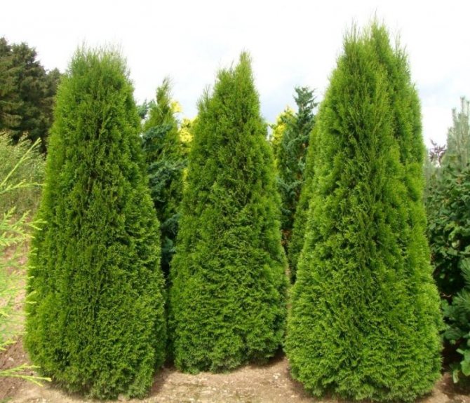 Выбор для тех, кто хочет увидеть творение своих рук: живую изгородь из туи в короткие сроки. Скорость ее роста – полметра в год. Для создания плотной и пушистой кроны, необходимо стричь культуру 2 раза на сезон. А для получения непроходимой зеленой изгороди – посадку проводить через метр. | Так же обладает конической кроной и светло-зеленым цветом хвои. Крона узкопирамидальная, сохраняющая зеленый цвет на протяжении всего года. Крона пышная, не нуждается в частой обрезке, т.к. растет медленно. Чтобы зеленая стена была плотной, следует высаживать растения через 80 см друг от друга. |
